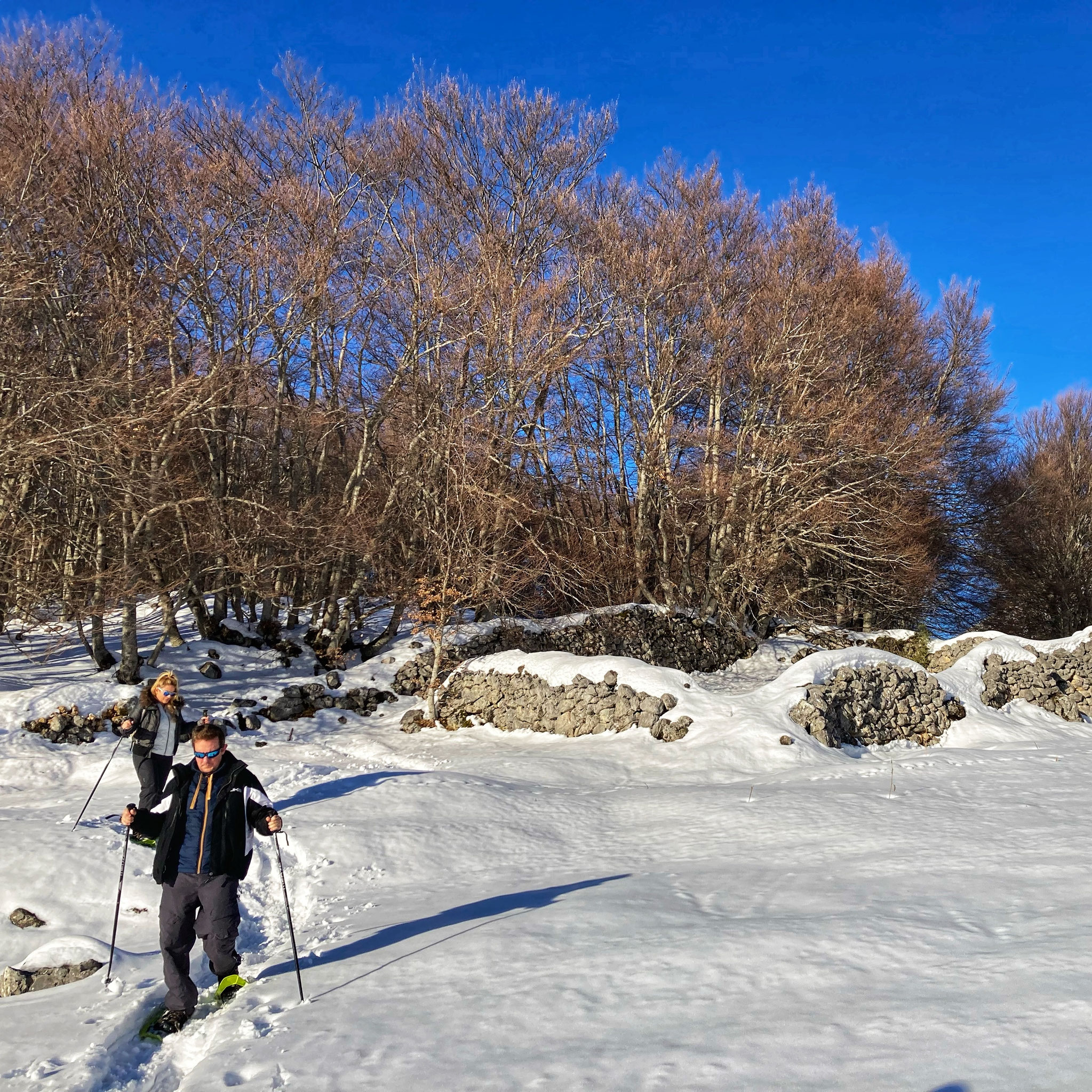 L'escursione inizia su un'antica via pastorale delimitata dai caratteristici muretti in pietra a secco, testimoni della storia agropastorale della Maiella. Il percorso è vario e mai noioso: dopo un breve tratto erboso in discesa, cammineremo su un comodo sentiero di terra e pietrisco (o neve battuta) che sale in maniera molto graduale. Nessuna salita ripida spezza-fiato: è una piacevole passeggiata che ci porterà dolcemente fino al limitare del bosco e poi su una pianeggiante prateria, ideale per godersi il panorama e scattare foto indimenticabili.